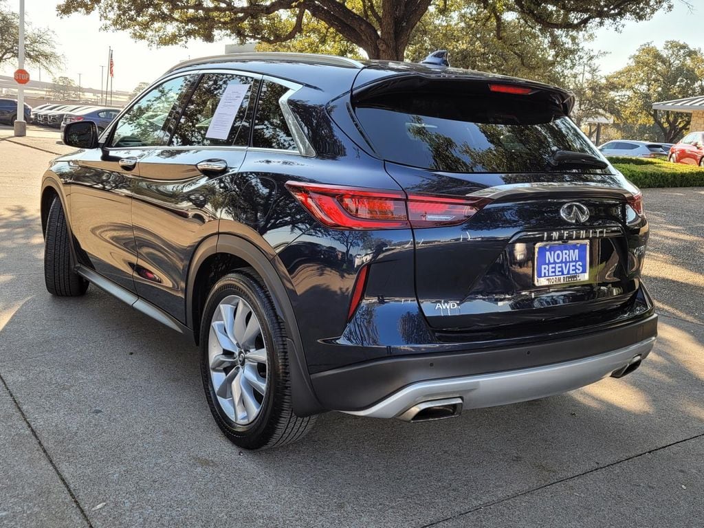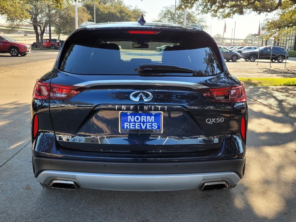 This 2022 Hermosa Blue INFINITI QX50 LUXE AWD is well equipped and includes these features and benefits: QX50 LUXE, AWD, Graphite Leather, 4-Wheel Disc Brakes, 5.846 Axle Ratio, 6 Speakers, ABS brakes, Air Conditioning, Alloy wheels, AM/FM radio: SiriusXM, Anti-whiplash front head restraints, Auto High-beam Headlights, Auto-dimming Rear-View mirror, Automatic temperature control, Black Splash Guards (Set of 4), Brake assist, Bumpers: body-color, CD player, Delay-off headlights, Driver door bin, Driver vanity mirror, Dual front impact airbags, Dual front side impact airbags, Electronic Stability Control, Emergency communication system: INFINITI InTouch, Exterior Parking Camera Rear, Floor Mats, Four wheel independent suspension, Front anti-roll bar, Front Bucket Seats, Front Center Armrest, Front dual zone A/C, Front fog lights, Front reading lights, Fully automatic headlights, Garage door transmitter: HomeLink, Heated door mirrors, Heated Front Bucket Seats, Heated front seats, Illuminated entry, Illuminated Kick Plates, Knee airbag, Leather Shift Knob, Leather-Appointed Seat Trim, Low tire pressure warning, Occupant sensing airbag, Outside temperature display, Overhead airbag, Overhead console, Panic alarm, Passenger door bin, Passenger vanity mirror, Power door mirrors, Power driver seat, Power Liftgate, Power moonroof, Power passenger seat, Power steering, Power windows, Radio data system, Radio: HD Audio System, Rear anti-roll bar, Rear Parking Sensors, Rear reading lights, Rear seat center armrest, Rear side impact airbag, Rear window defroster, Rear window wiper, Remote keyless entry, Security system, Speed control, Speed-sensing steering, Speed-Sensitive Wipers, Split folding rear seat, Spoiler, Steering wheel mounted audio controls, Tachometer, Telescoping steering wheel, Tilt steering wheel, Traction control, Trip computer, Turn signal indicator mirrors, Variably intermittent wipers, Welcome Lighting, and Wheels: 19" Silver Painted Aluminum Alloy. QX50 LUXE, AWD, Graphite Leather.